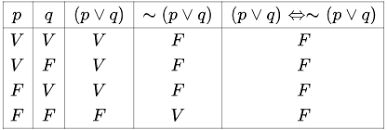 Continuando con el tema de las combinaciones, hoy vimos la disyunción con dos proposiciones. En este caso, con solo tener un proposición verdadera todo se convierte en verdadero. Por ejemplo, p es verdadera y q falsa, entonces si se niega p y q, en una disyunción, el valor será verdadero.